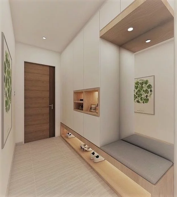 进门空间在柜体处隔断出了一个小格,内里安上小灯照明。在玄关进门的鞋柜除过头顶的主要照明灯以外,镂空上下都可以做成感应灯,这样进门自动亮起也是非常实用,同时灯光层次更好,进门第一感觉更有家的温馨。除过鞋柜镂空区域的氛围灯以及感应布置,头顶可以采用灯带营造更温馨的门厅空间。