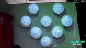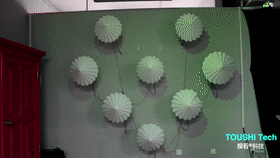 投石科技机械矩阵纸伞是新媒体艺术与技术革新相融合下的产物,设计提取“伞”的元素,自由组合,不但可进行表演效果,还可进行新颖的商业广告展示。让观众不但享受震撼的视觉秀表演,还能在交互同时获取广告卖点,增加广告竞争力,扩大商业综合体知名度。是商业综合体、城市亮化、商业广告、舞台等提供一种创新的新媒体艺术展现形式。