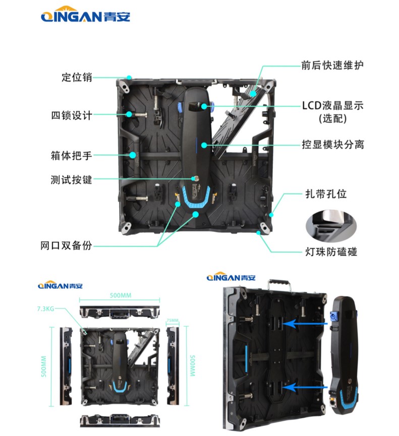 高端全私模设计,体验与完美的流线设计相结合,科技感十足。10秒钟快速更换控制模块,快速拆卸模组螺丝。四锁、灯珠防磕碰设计,增加整体外观的完美性和安全性。采用高效电源、进口IC,整体稳定性更好。双信号口、硬链接设计,增强信号箱体的稳定。插件镀金、人性化的扎带孔位。一键测试功能、小卡设计控制仓内更简洁、更稳定。加装LCD液晶显示、采用优质灯珠。产品消除亮暗线设计。
