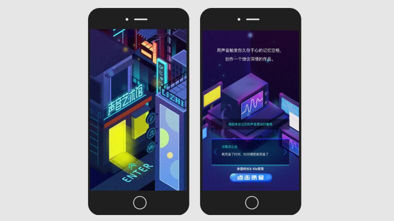 H5介绍:以声音为主角,通过用户的声音画一幅画。首先是声音艺术馆入口,进入艺术馆,横向滑动收听8个不同音乐的声音,同时对声音有解释说明文字,点击【创作你的声音艺术】按钮,进入用户制作页面,下面有10句让用户读的文字引导,也是横向滑动观看,当然,不按提示说也可以,点击录音,用户说话,系统自动识别音频信息,最后生成用户声音的鉴定海报,里面有音乐画作、音色鉴定、音色评分和声音密码。