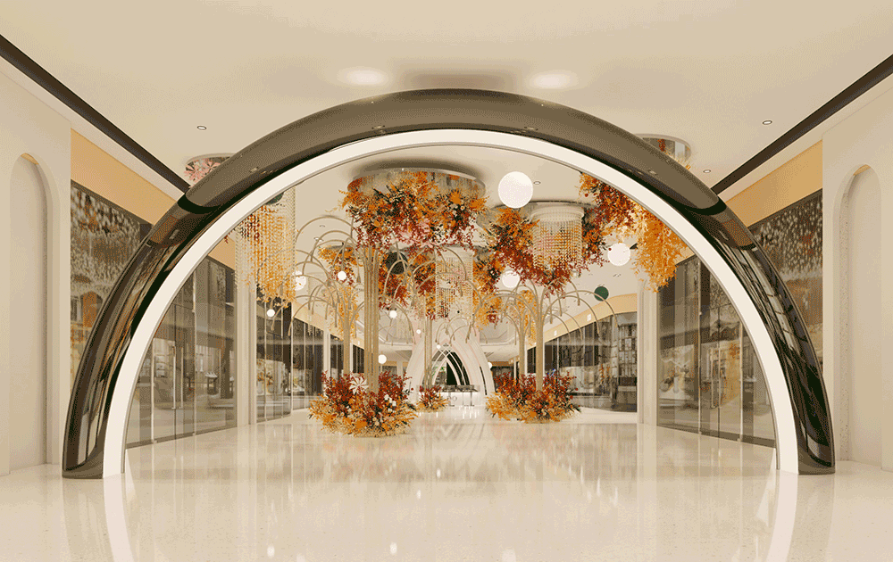 眼前是一个巨大的“荷花城堡”,它环抱着连廊,也向所有人敞开着怀抱。层层叠叠的荷花造型将空间中最宽的连廊连同分散的人流进行收拢,更可以实现多经点位的功能,并鲜活地点明主题,强烈的视觉冲击吸引着远处的人趋近并驻足,而花瓣镂空的设计则让横穿整个楼层的巨型装置变得可视、通透,商铺不会被遮挡。