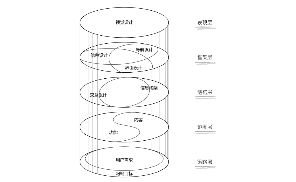 Ajax 之父”基斯吉姆哥特(Jesse James Garrett)在《用户体验的要素》一书中,为了清楚地阐述用户体验的整个开发过程,将网站/APP建设分成:策略、范围、结构、框架和表现五个层级,每个层级都由若干要素组成。