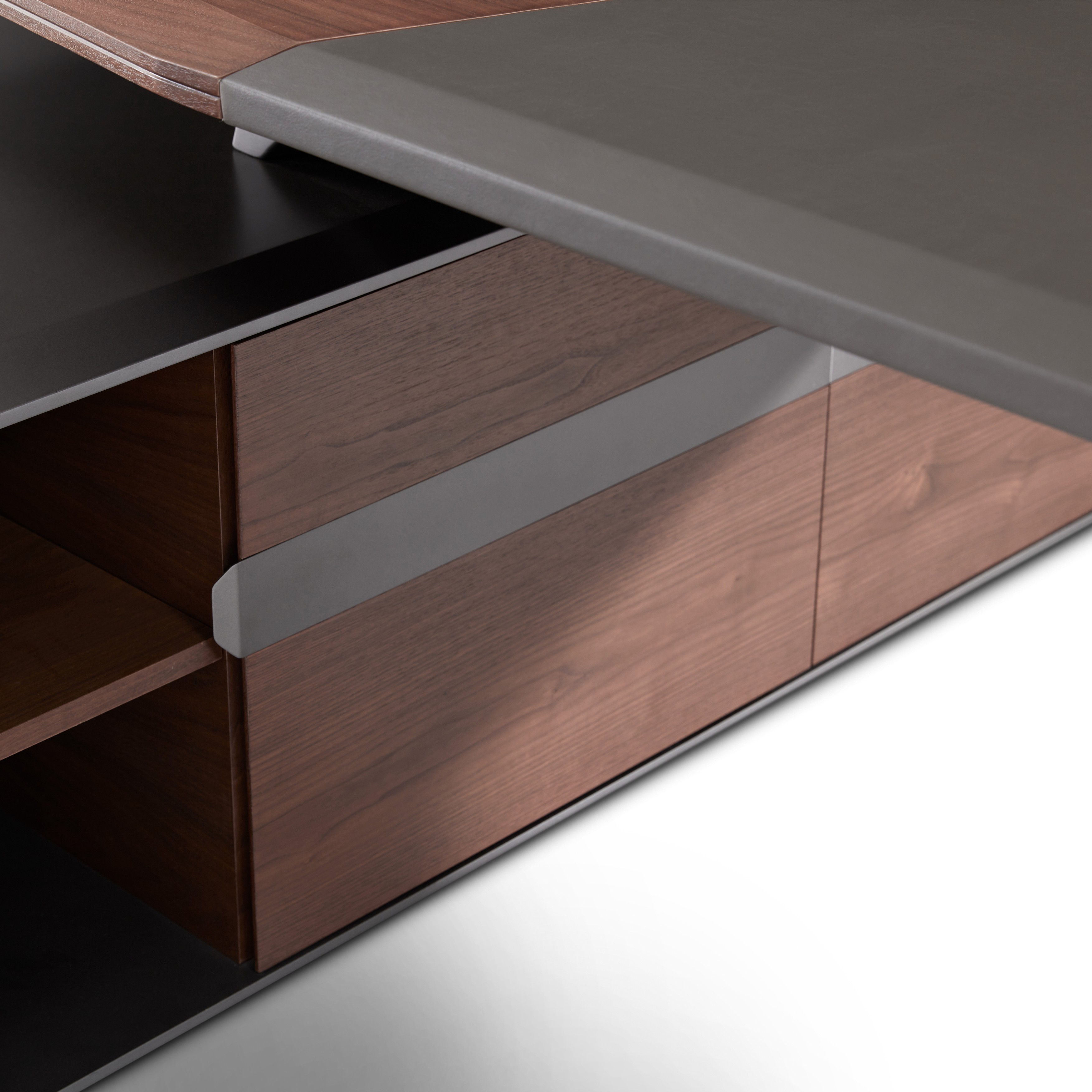 奥伦蒂是一款响应空间建筑设计的行政办公桌。奥伦蒂将轻盈、活力的悬浮感作为此产品的设计主题。独具建筑外观特色的平滑桌脚打造了一种强大稳定的悬空视觉效果。这是一场十足张力与柔美曲线之间的、极富表现力的现代艺术视觉盛宴。 奥伦蒂桌子采用70年代实木家具中蕴含传统的设计元素和卡拉特拉瓦作品中体现的建筑设计美感精髓,结合现代人需要的各种功能性设置,如线盒、可放置私人物品的移动托盘以及遮脚板。高品质的结构材料和真空处理表面更是为奥伦蒂增添了一股科技感。