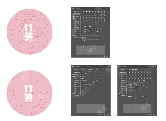 “硬度”参数比较特殊,大部分笔刷状态下这个功能是置灰的。在一些特殊的笔刷效果中,“硬度”参数是可以调节的。同一只不刷调节硬度之后,笔刷效果如下。