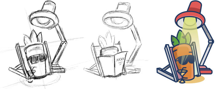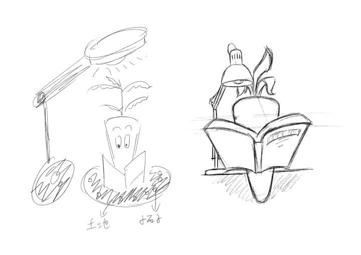 显然这位委托人对胡萝卜的种植技术十分专业,虽然我们并不认为卡通Logo设计需要太强的合理性,不过劝说委托人未果的情况下也会根据委托人的要求来进行设计,最终的稿件如其所言就是一颗在台灯下晒日光浴的萝卜,看书的动作因为会挡住脸所以在成品稿件中被抛弃掉了。