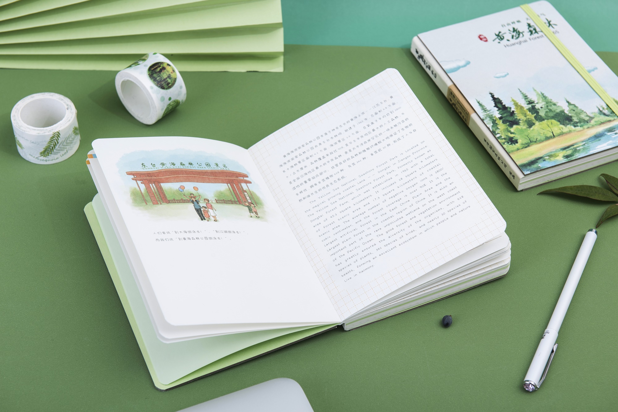 我们围绕黄海森林的景点、美食、交通、住宿、游览路线等信息,以文艺唯美的彩色插画为载体,设计了这款精致的森林手账本。
