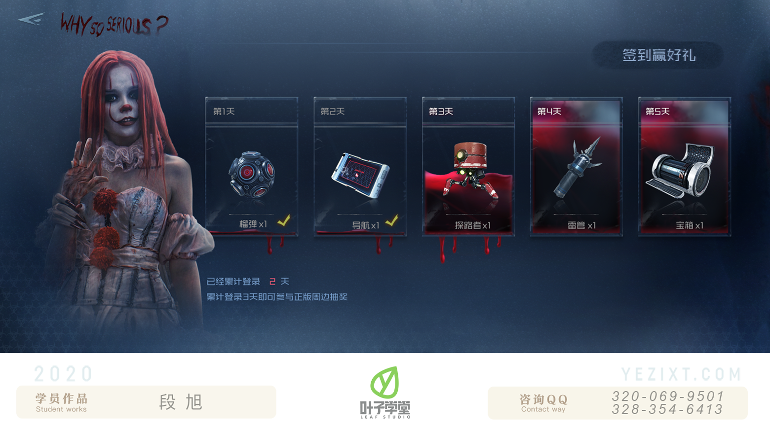 这套丧尸题材的界面,第三张图最早的想法是ICON放在了包装袋上面,为了增加画面的趣味性和贴合恐怖的主题,我在包装袋里加入了血浆元素,为了进一步提升界 面的趣味性和功能的识别度,我用已抽干的血袋做为已领取的选项,正在流出的血袋做为当前需要签到的选项,满血的血袋做为未签到的选项。