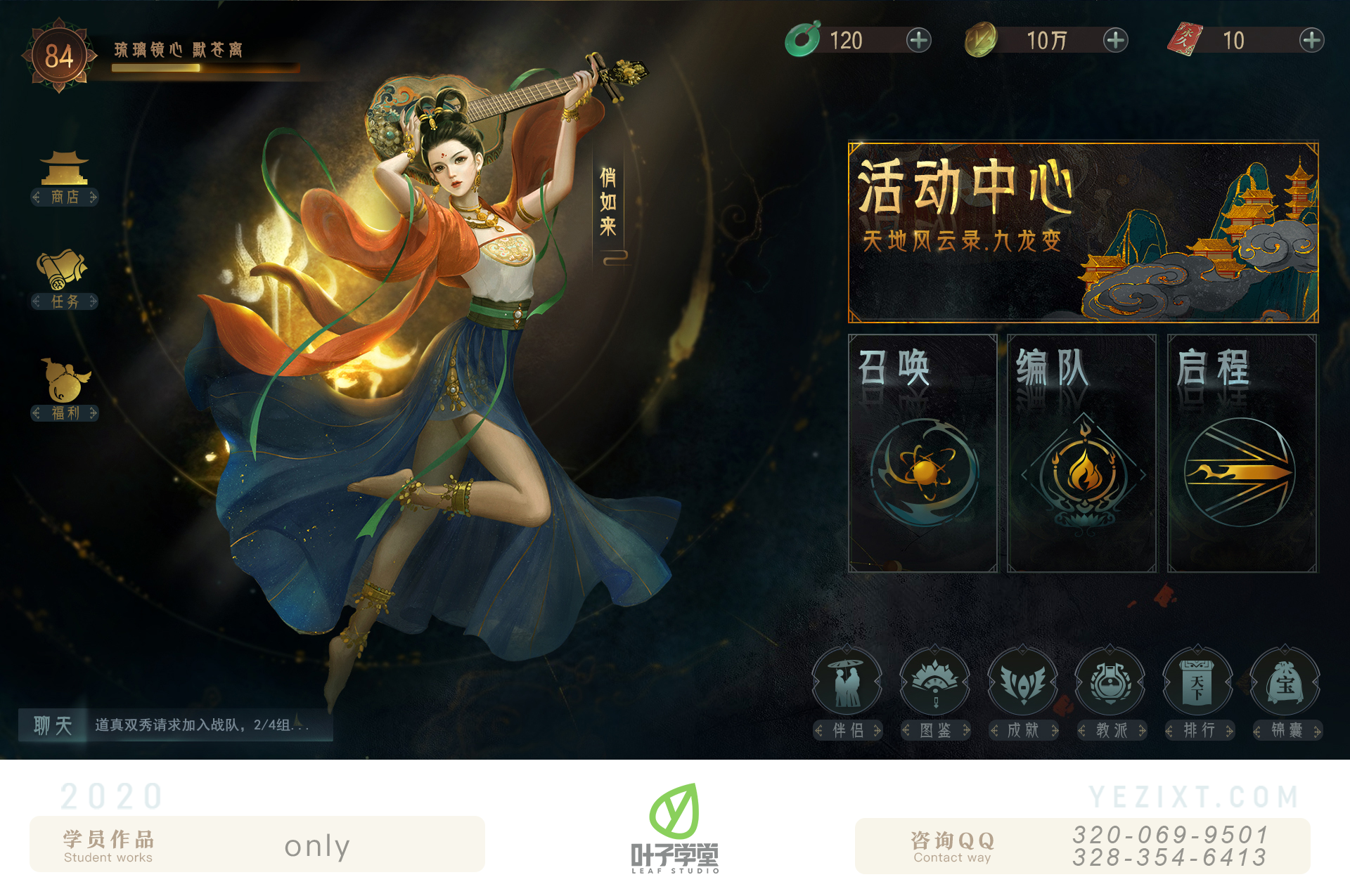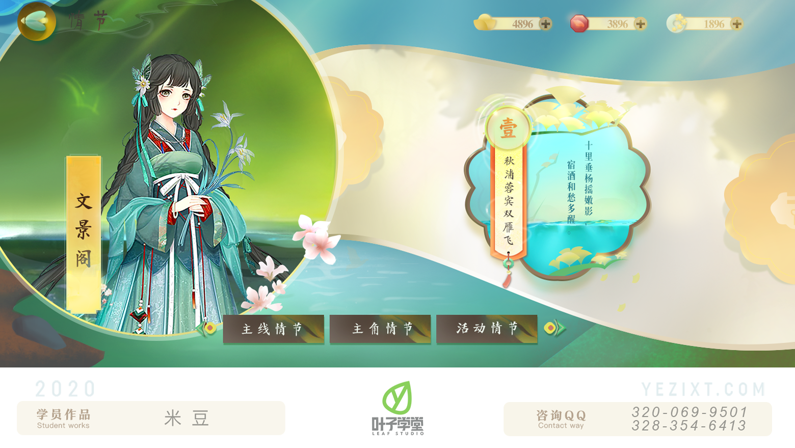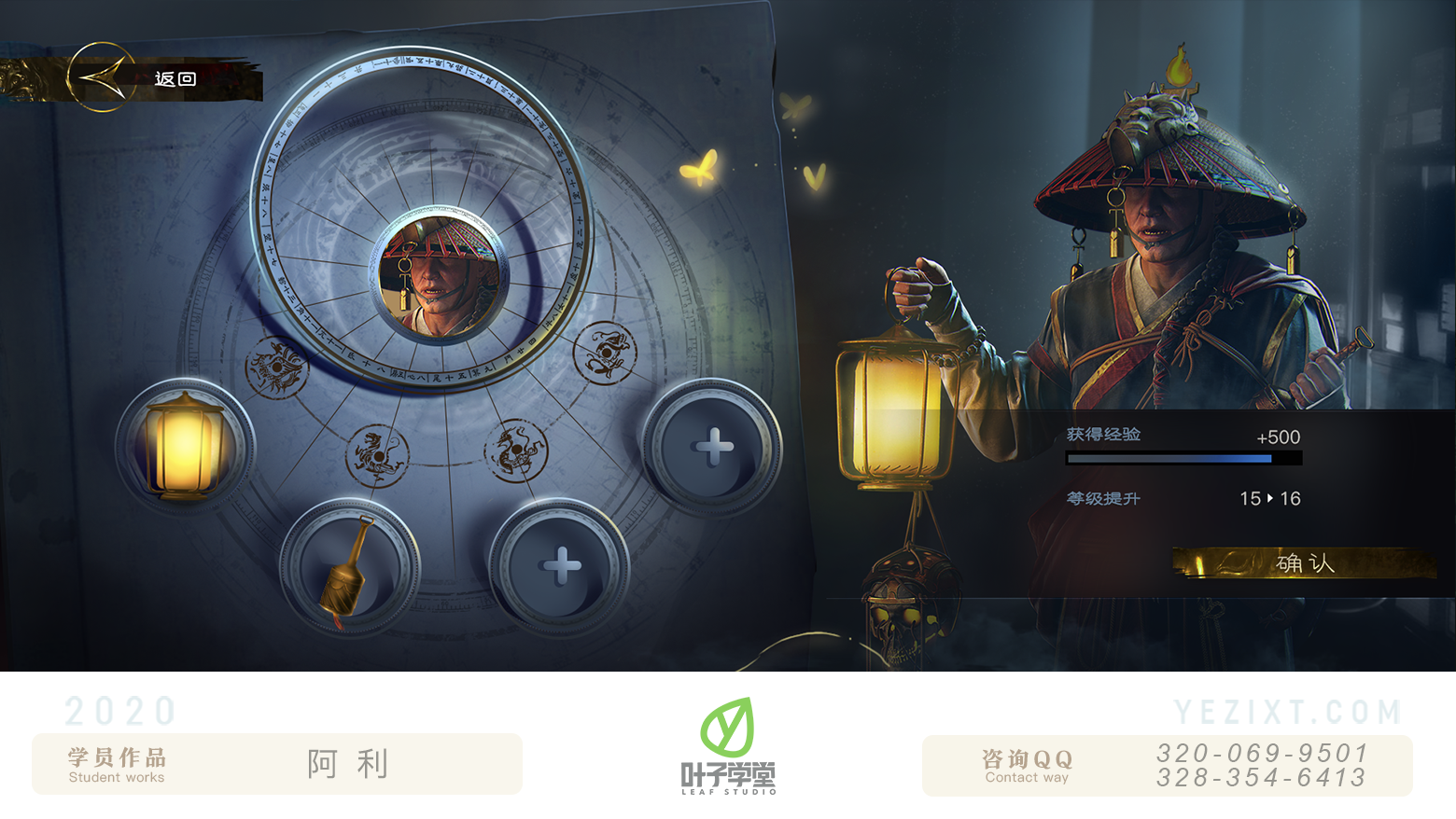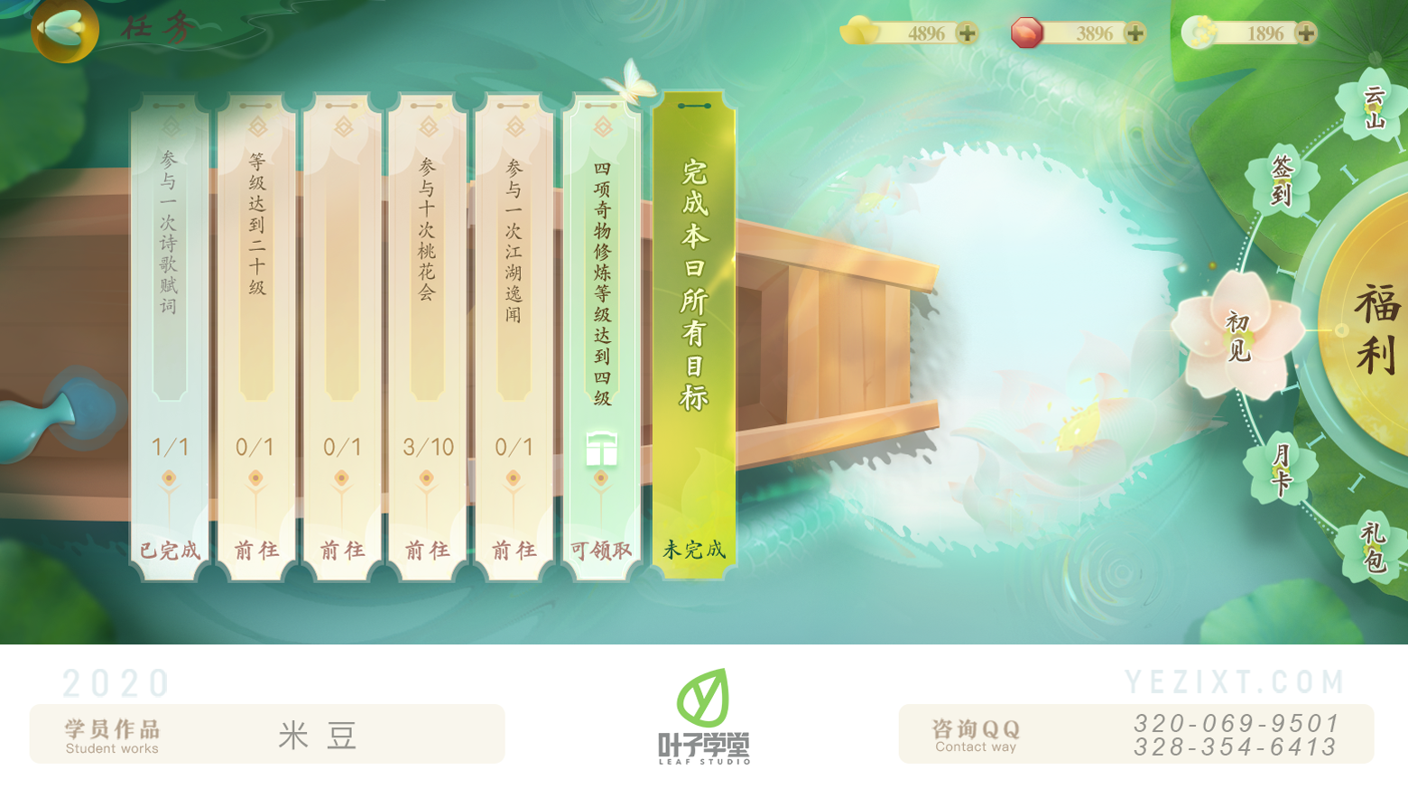 我们平时做构图的时候,很少考虑到镜头,上面这张界面用了俯视的技巧来做构图。这个同学如果后续加上一些动效的技巧,那么这张界面的场景可以是在下阳光雨,当我们打开这个界面的时候,船缓缓地摇动,空中有雨滴滴在湖面上产生涟漪,这样营造的氛围就会更强。让玩家体验到在船上醉酒游湖的感觉。