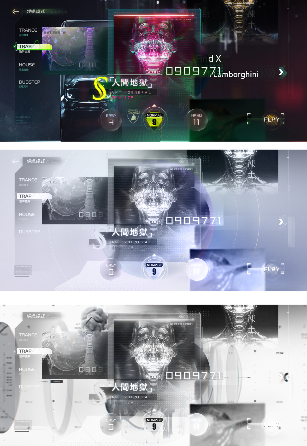 在前期尝试不同风格时,可以用p图的手段迅速做调子、做效果,但是一套有特色的ui界面,要根据“主题”来引申核心关键字进行设计。