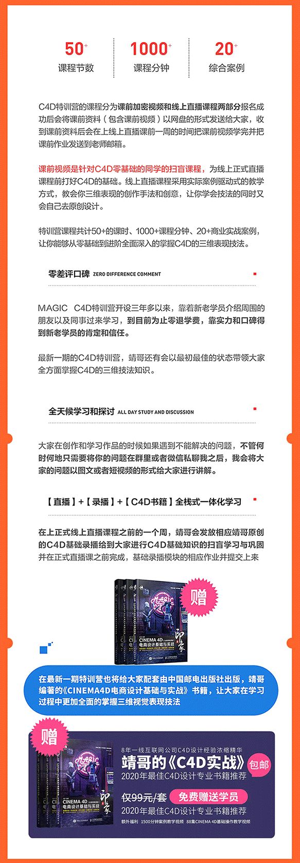为了帮助大家学的扎实,学的舒心,课程还进行了针对性的学习安排:【课前课程】+【线上课程】+【C4D书籍】三个方面全栈式的课程学习模式,让大家三维设计能力从零基础到高级进阶的飞跃!!