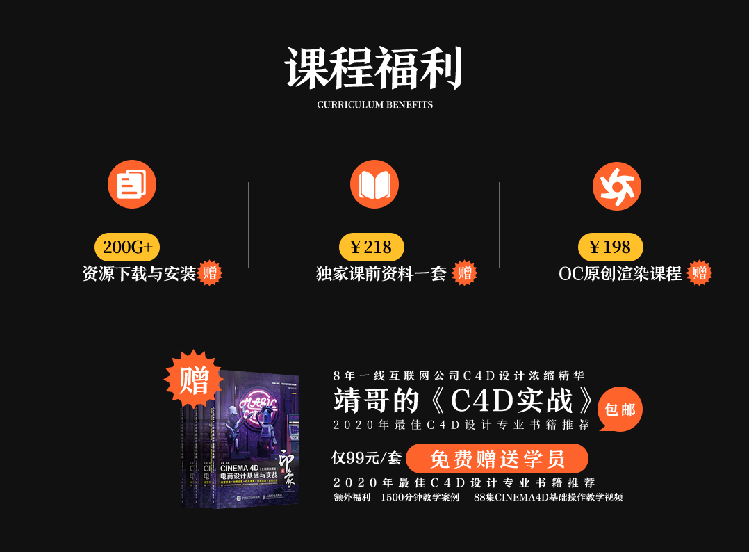 既然是年末C4D的压轴之作,那福利肯定不能少!200G+资源下载与安装、价值218元的独家课前资料一套、价值198元的OC原创渲染课程、价值99一本的《C4D实战》书籍通通免费赠送!