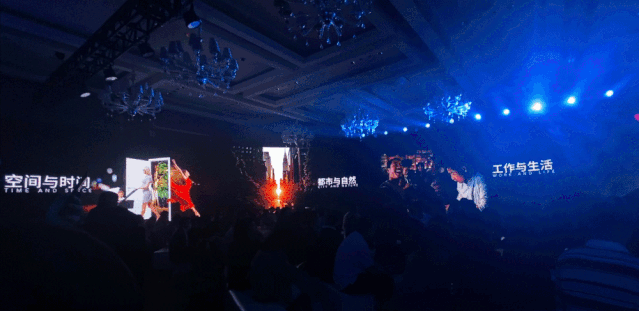 因为是超宽屏,为保证观众的视线集中在舞台中央,我们把关键信息和重要内容都锁定在中间11m的屏幕上去展示,两侧作为观赏区域,随着内容平滑到下一个重点,这样无缝转场效果带来的沉浸感非常赞。