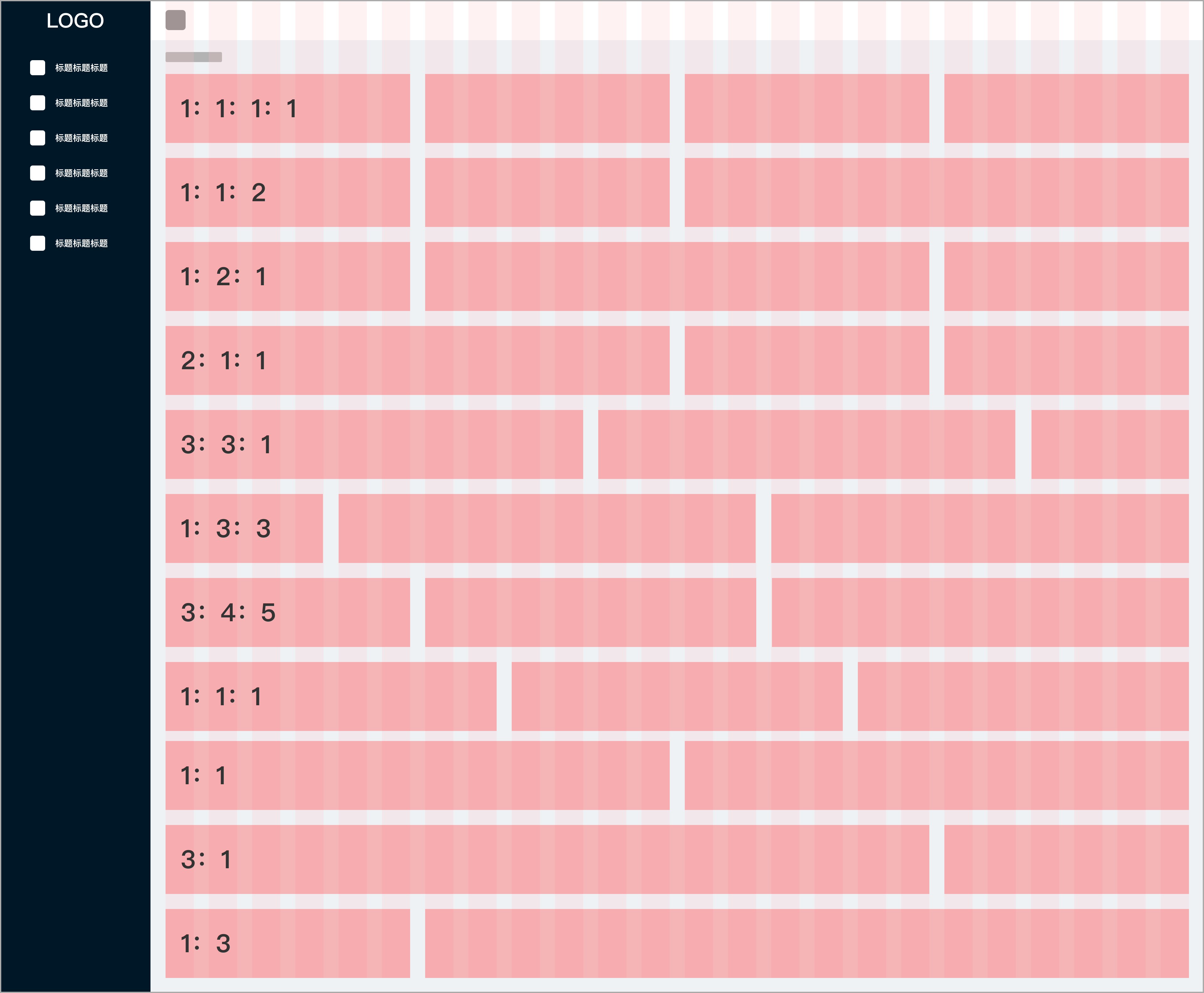 “盒子”会根据栅格数量的不同进行等分或不等分,比如:1:1:1、 1:2:1、 2:5:5、 3:4:5、 1:1:1:1,具体采用哪种组合需要我们根据产品的业务需求来定;比如当页面需要承载更多更杂的信息时,便可使用24栅格,然后根据24栅格我们对“盒子”进行更多的组合,从而放置更多更复杂的信息