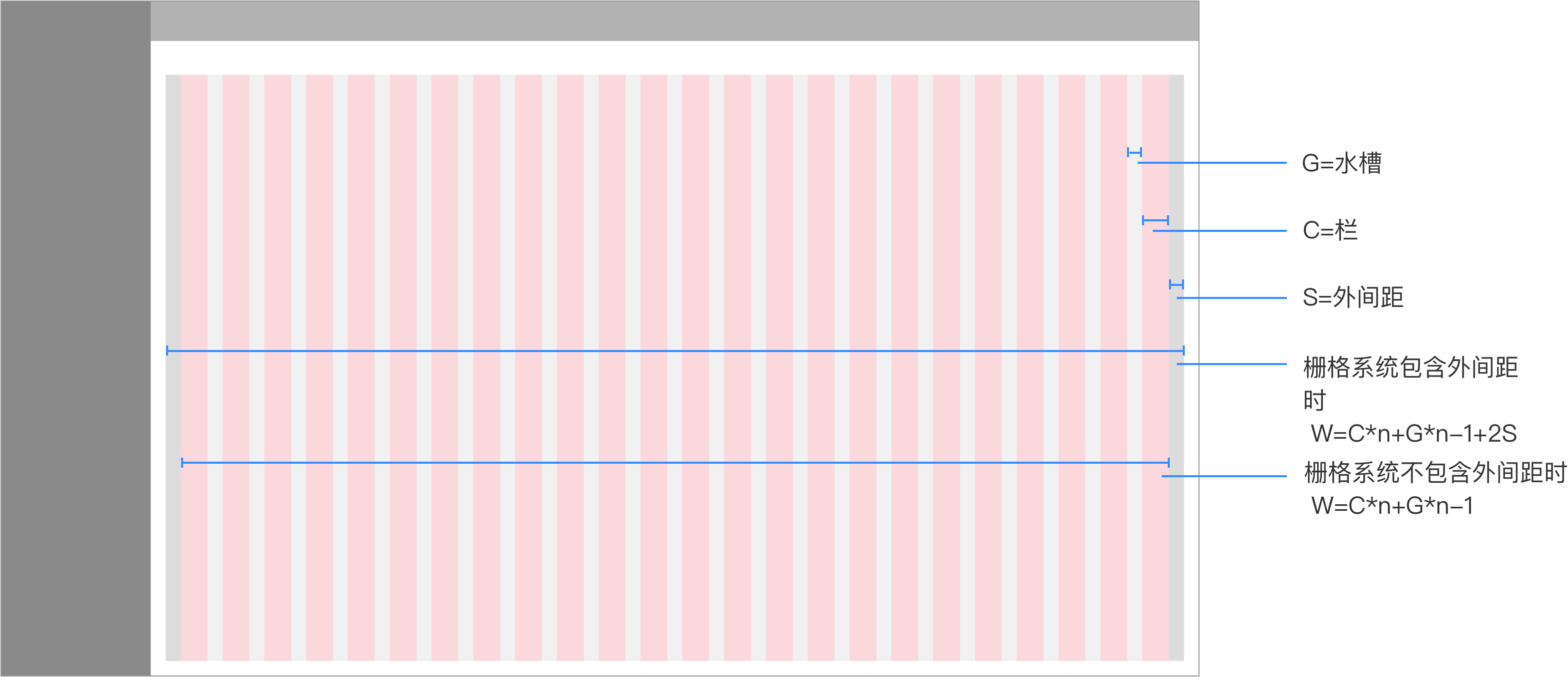 如图所示: G=水槽 C=栏 S=外间距 W=栅格系统总宽