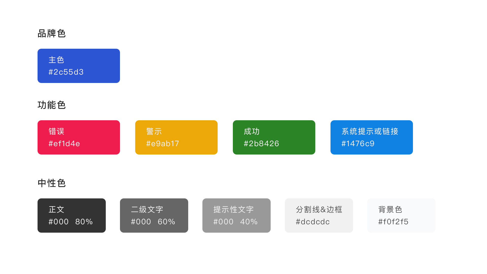 颜色上大致分为品牌色、功能色、 中性色。品牌色可根据业务属性来定,功能色遵循用户对色彩的基本认知,比如红黄绿蓝灯成功、出错、失败、提醒、链接等,中性色多用于文字,此外背景色、分割线、边框等也很常见。其他色如统计图、数据可视化、多个标签的不同配色方案根据项目具体情况来单独设定。