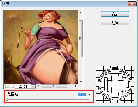数量:控制图像变形的强度,正值产生凸出效果,负值产生凹陷效果,范围是-100%到100%。