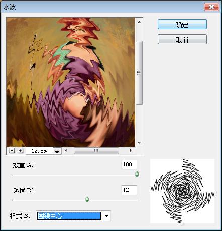 其中,数量:波纹的波幅。起伏:控制波纹的密度。围绕中心:将图像的像素绕中心旋转。从中心向外:靠近或远离中心置换像素。水池波纹:将像素置换到中心的左上方和右下方。