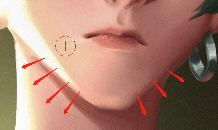 五、按住鼠标左键,将下巴向外拖动,一点一点的,注意左侧下巴的受光带也要一并拖动。
