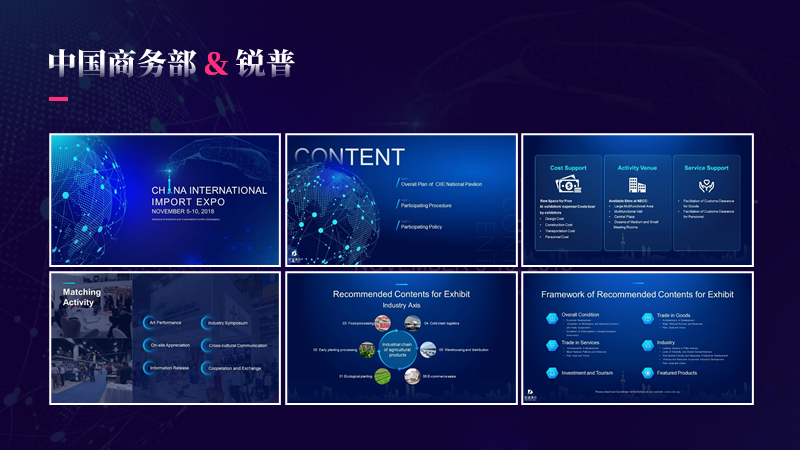 不信你看,锐普给首届上海进口博览会定制的汇报PPT,就采用了科技蓝的色系。