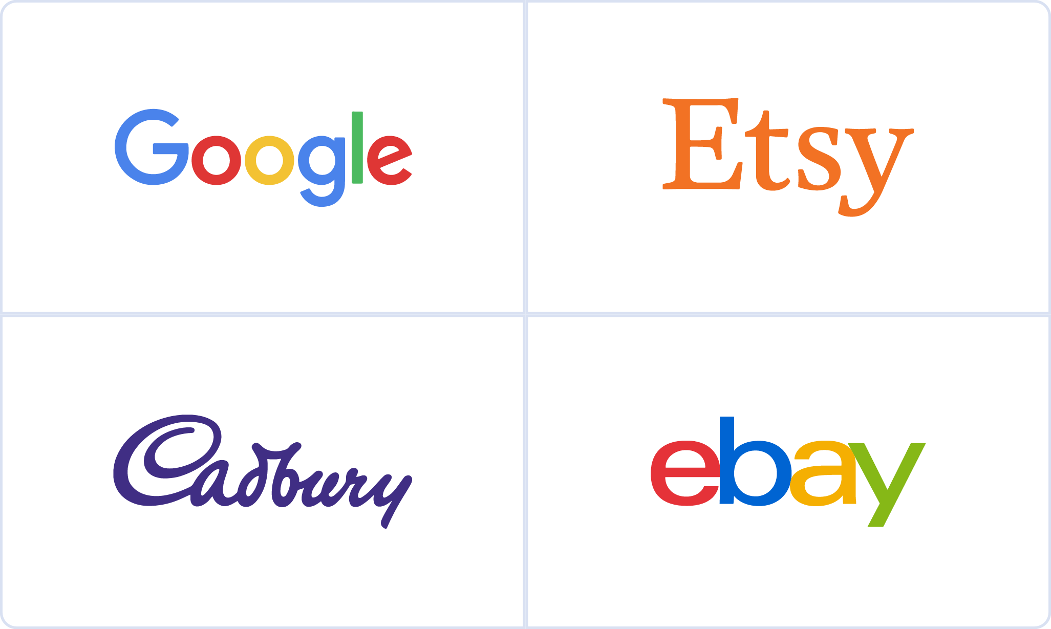 想像一下Etsy柔和但柔和的橙色,谷歌和eBay的多色徽标以及吉百利的皇家紫色。