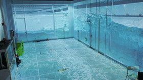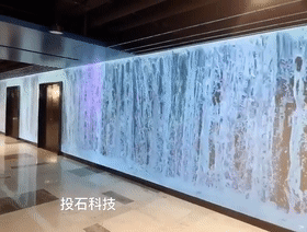 投石科技在一面长13.6米,高2.4米的墙面上,利用墙面投影技术在室内体现水的特质。水流从墙面顶部快速流下,会泛起白色的水花,同时还伴有瀑布浪花水流花溅射的音效。