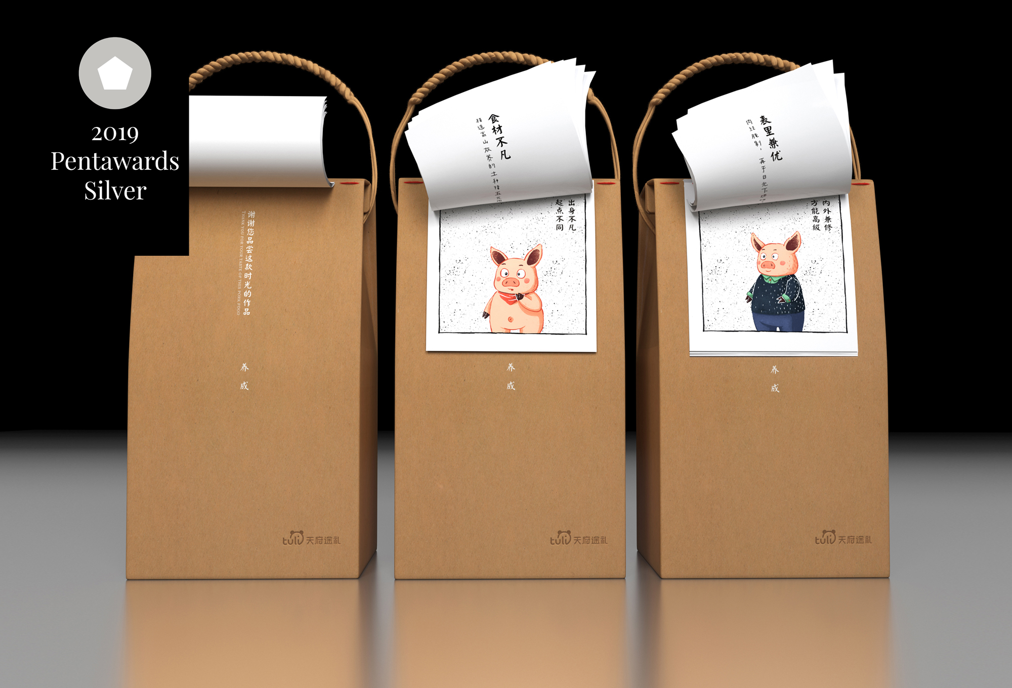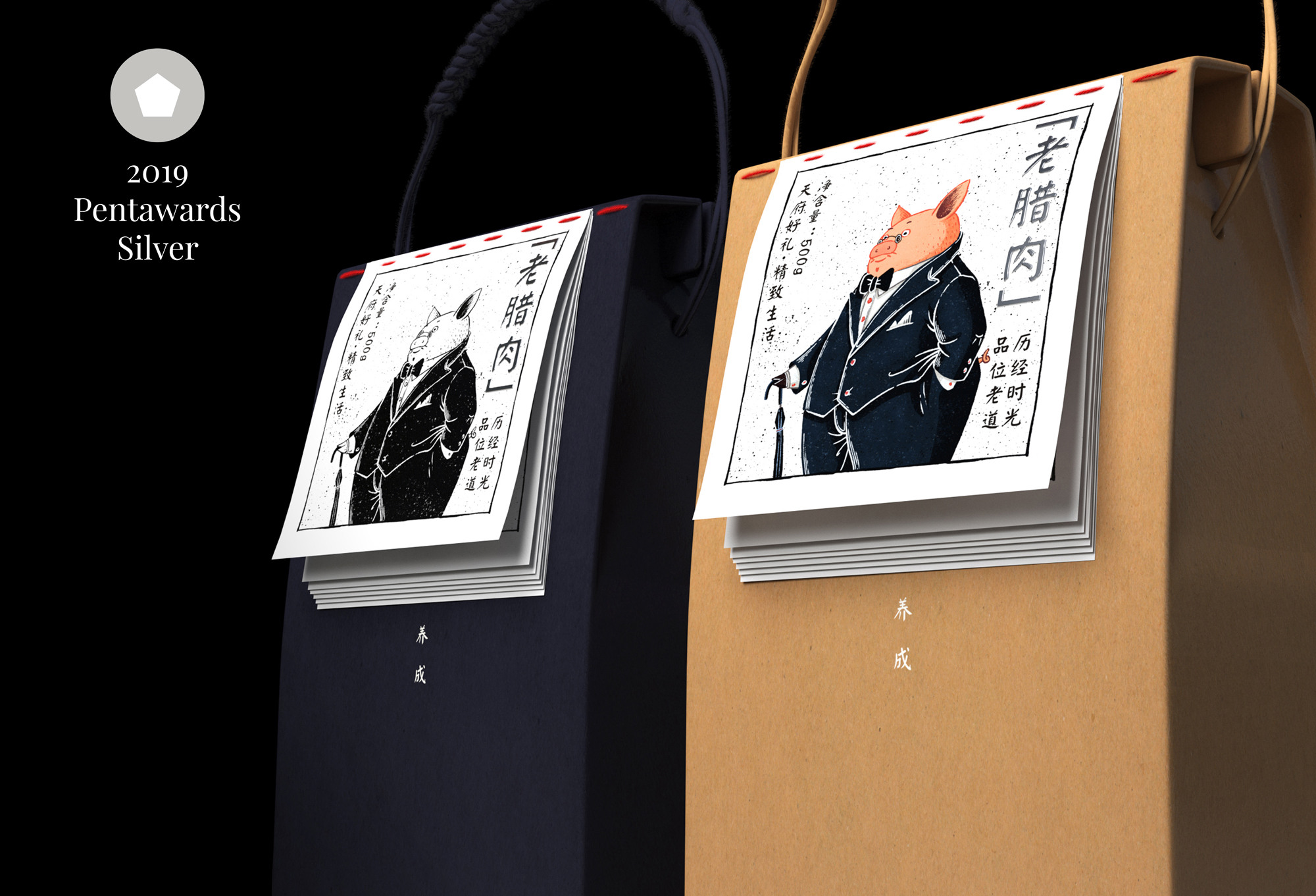 A:《猪大叔老腊肉》是我比较喜欢的设计作品,它代表我与众不同的思考方式和设计源于生活的细心观察。这个设计灵感来源于中年大叔的成长故事,也是本人对心态日益老成的有感而发,可以说我就是猪大叔的原型。“老腊肉”这个词一语双关,在中国有两种含义表达,一是指猪肉腌制后的加工食品,另一种是指长相成熟富有内涵的中年大叔。包装设计提炼了“历经时光,品位老道”的概念,把两种不同的含义进行了关联,将猪宝宝变成猪大叔的成长过程和手工腌制老腊肉的制作过程进行了一一对应的创意设计,讲述了一个“老腊肉制作记 & 猪大叔成长记”的故事。这个作品正是因为我常常对生活保持敏感和观察,因此在短短的三天时间便独自完成了整个包装概念、文案策划和创意设计。