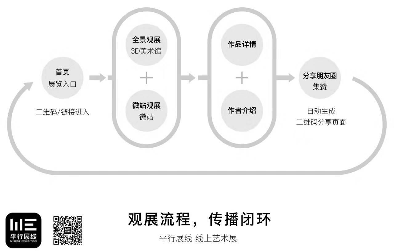 主办方发布展览新闻或海报,观众通过二维码或观展链接进入展览。观展形式分3D虚拟展厅和微站两种形式,观众可以自由选择。