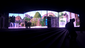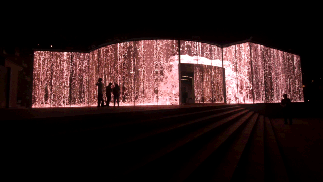 投石科技在一面长13.6米,高2.4米的墙面上,利用墙面投影技术在室内体现水的特质。水流从墙面顶部快速流下,会泛起白色的水花,同时还伴有瀑布浪花水流花溅射的音效。