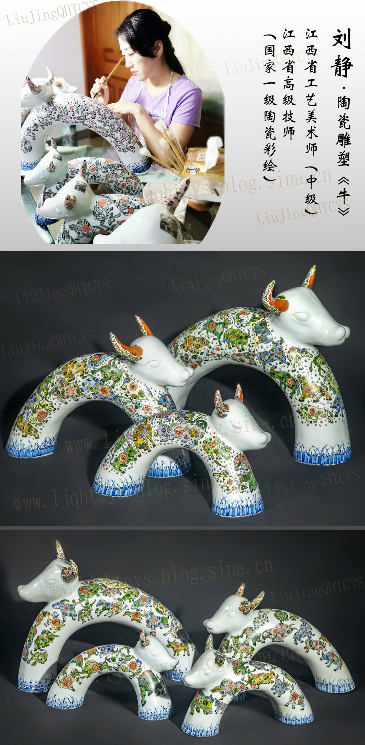 我自从景德镇陶瓷大学毕业后踏入社会进入艺术领域以来,痴迷于陶瓷艺术的创作,徜徉在人类这一“火与土”的艺术世界里将近十年,在多年的学习和实践中,我找到了陶瓷艺术的乐趣,我的这套作品统称为《家和.福满.万事兴》,是我创作的现代陶瓷雕塑《牛》系列艺术作品,这是套组雕塑秞上古彩和釉下青花相结合的陶艺作品7头牛(牛爸2头、牛妈2头、牛宝3头),也可以称作现代陶艺作品,这套陶瓷雕塑《牛》系列作品的形状采用了夸张变形的大胆尝试。我觉得现代陶艺正处于传统学习与现代探索并存的一种阶段,每一位艺术家都可能在陶艺创作造型上千变万化,烧制方法上也可千差万别,但重要的是都要有自己独特的艺术生命力和思想情感的表达。我在这套雕塑艺术创作中,注入了很大的心血与感情,这样出来的作品才具有丰富、细腻的情感。每一个古彩牛的图案,其形态都不一样,哪怕是同一个系列的作品,古彩牛的神态也不一样,有坐着的,有站着的,有奔跑的,有吃草的,有干活的,有唱歌的,有嬉戏的等等,都有我的细腻情感渗透在里面。这套陶艺雕塑作品采用印坯成型的方式制作而成,古彩装饰图案彩绘提取了民间剪纸图案“牛”,平时得空了也会跟着潘凯声老师的写生团队出去写生,会在景德镇的乡下看到很多水牛,我也会用相机拍摄下来储存素材。各种各样的牛的姿态分别分布在陶瓷雕塑牛爸牛妈牛宝的身体上,牛爸身上有45个|42个牛图案,牛妈身上有24个|32个牛图案,牛宝身上有16个|16个|19个牛图案,这些图案总共194个分布在7头牛身上,是牛的灵魂的体现。艺术创作不应仅仅反映自己的感受,还要关注社会、人文,要给予人们多方面崭新的情感表达。明年就是牛年了,我的这套作品正好应景了,伴随着2020年年尾的临近,我们即将迎来2021年中国农历辛丑牛年,“牛”气十足景德镇第四届陶瓷雕塑生肖节也在征集作品中,我的这套雕塑牛作品《福满家园》前几天已经拿去参加比赛了,离大赛报名结束还有几天,重在参与。艺术创作要回归生活,观察生活,抽取生活有趣的细节要素来进行创作,学院派也好,民间艺术家也好,自由职业艺术家也好,关键是做出好的作品,才会有说服力。材料是作品的载体,情感是作品的灵魂,只有把情感注入作品才会有生命的绽放。《华严经》曾谓道:“佛土生五色茎,一花一世界。”英国诗人布莱克《天真的预言》中也说道:“一沙一世界,一花一天堂。”我突然想到一些句子:《辛勤耕耘天地间,奋蹄何须君扬鞭。培得桑田成沃土,五牛孺子耒丰年》,是呀,牛是多么勤劳的,牛是多么坚韧的,牛是多么执着的。雕塑作品中这么多只牛欢聚在一起,多么的和谐。作品的特色是多只牛同时在一头牛的脊背周围,中间分别穿插了多样的耕地,小草,分布在不同的牛的图案的周围,俯首甘为孺子牛的精神一览无余,好生热闹,一头牛的身上彩绘多只牛这是独一无二的现代雕塑艺术。《家和.福满.万事兴》雕塑艺术作品中两家牛时而耕种,时而依偎,时而引吭高歌,时而休憩,时而奔走,时而奋勇前进,不论是大家还是小家,福气满满,吉星高照,牛气冲天。对我来说,每一件作品就是一个独立的艺术情感世界,我愿意毕生在“火与土的艺术”里耕耘不辍,探索新的装饰形式,探索新的陶瓷创作艺术,在这个世界里,细观古人制陶之境,深问今人创造之理,既要从浩如烟海的传统文化里寻觅诗意的真知,又要从千变万化的现代艺术形态里归纳理性的智慧,让浪漫与现实、理性感性的智慧弥散在自己未来的陶瓷学术境界和艺术人生中。想到很多至理名言:《横眉冷对千夫指,俯首甘为孺子牛》、《老牛亦知夕阳晚,不用扬鞭自奋蹄》和《风吹草低见牛羊》。作品中各种牛姿态的演绎,让人富有力量,充满希望。大家团结在一起相互照应,合家欢聚的场景让人感慨万分,有种合家欢乐,家和万事兴的精神力量。牛的一生勤勤恳恳,踏踏实实,乐于奉献,辛勤劳作,都是牛的精神的体现,通过各种牛的古彩彩绘颂扬了牛的坚毅和执着,以及勇往直前的品格,这套作品诉说了我对于牛的热爱和钦佩,踏踏实实走好每一步也是我生活和学习的一种精神,在我的微信备注里就写了这一句话“踏踏实实走好每一步”。此时回想起2017年在景德镇学院古彩基金研修班学习的日子,真的是收获满满,记得当时设计的牛的雕塑的初级作品一套3个牛,也是牛爸牛妈和牛宝,装饰图案不如现在的作品多,但是给人印象很深刻。后来在北京举办了展览,记得邀请函是这样写的:“国家艺术基金2016年度人才培养资助项目-《陶瓷古彩与现代陶艺人才培养》项目成果展,定于2019年1月11日-15日在中国美术出版总社人美美术馆举办”,记得当时我在景德镇有点事情忙就没有赶去北京参加开幕式,后来北京的朋友发来了关于成果展上北京CCTV新闻的报道,我仔细看了整个北京《朝闻天下》1月13日早上8点53分播出的一条CCTV-13新闻频道直播的《陶瓷古彩与现代陶艺人才培养》项目成果展的有关报道,很是惊讶和开心。“古彩元素赋予新面貌”几个大字闪耀在新闻屏幕的下方,其中有一个片段采访中,方漫老师指着我的陶瓷古彩与青花相结合的雕塑牛系列作品《耕牛俯歌.合家欢聚》说:“再一个我们与造型类相结合,这就是一个代表性作品,她做了一个抽象的牛的造型,又把古彩的元素赋予它新的面貌,这是原来传统古彩所没有的。”看