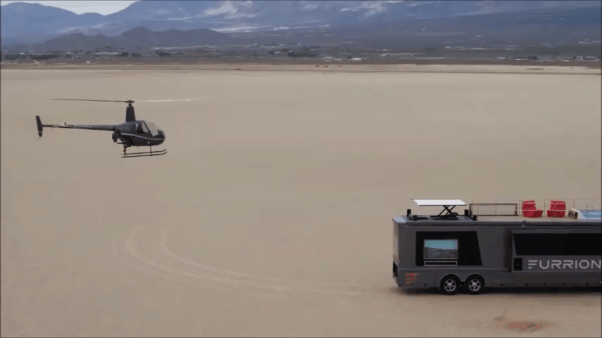 在车辆外部的设计上, 我们还可以在露营车顶部安装露天甲板和弹出式车顶,配备浴池、遮阳垫等装备,以方便乘客露营需求,而在露营车上停放直升机,则可以实现多式联运。