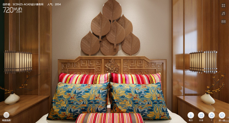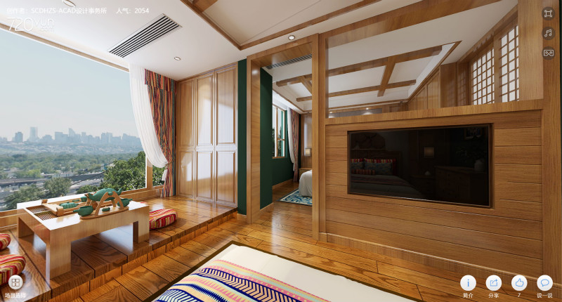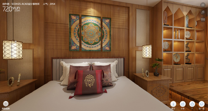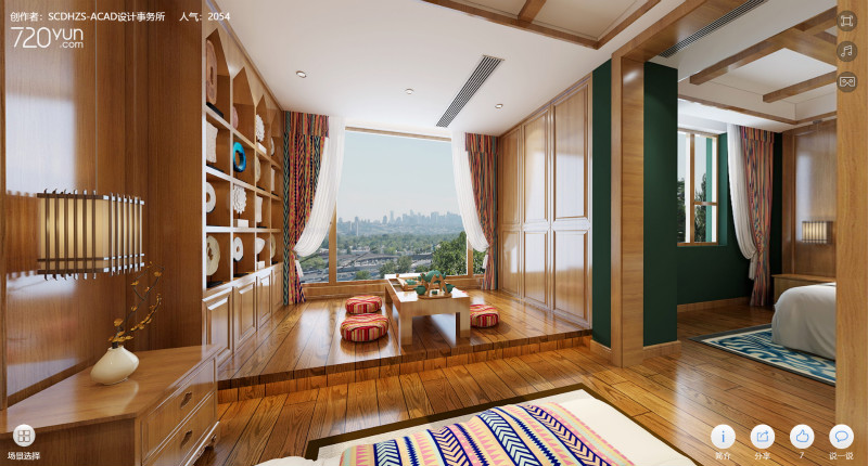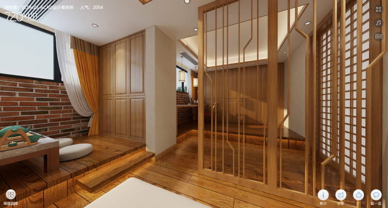 整个室内的设计多半是以原木来进行装饰,在色彩的搭配上采用浓郁色彩的软装如:窗帘、抱枕、墙饰等来进行空间修饰。设计师巧妙地运用这种修饰手法把整个房间的东亚风格体现了出来。