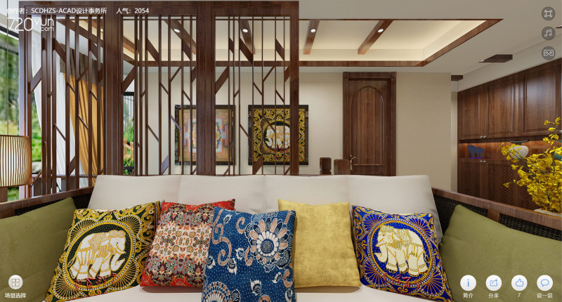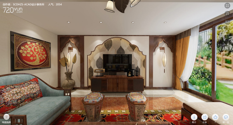 客厅设计:去过东南亚国家旅游过的朋友们都知道,东南亚那边有很多佛教的元素,比如佛像、烛台、香薰、佛手这样的工艺品很容易见到,所以想要打造地道的东南亚风格特点的居室,这些装饰品必不可少,它会让你的家又多了一丝禅意,也很适合有一定阅历的业主。在这里客厅内的设计不追求繁冗复杂,不矫揉造作,讲究的是内敛而不张扬的线条设计方式。东南亚的布艺品也是很出名的,颜色复杂艳丽,特别形象的表现出了东南亚的异域风情,所以像桌布、窗帘、沙发上的抱枕....甚至地毯都是可以抓住这样的点。