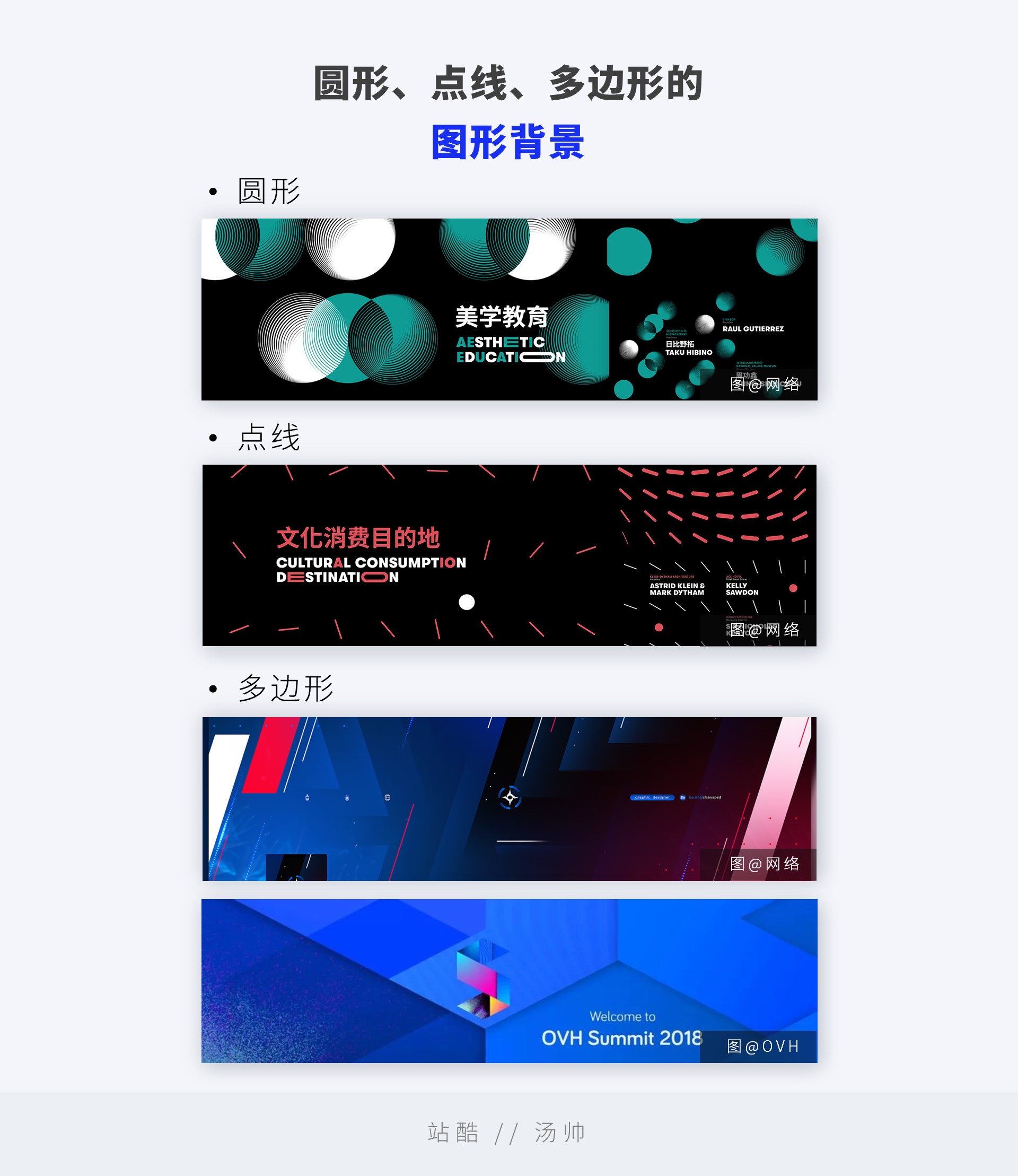 也会有一些情况会用圆形、点线、多边形来做页面的点缀,不同属性的形状会有不同的气质: