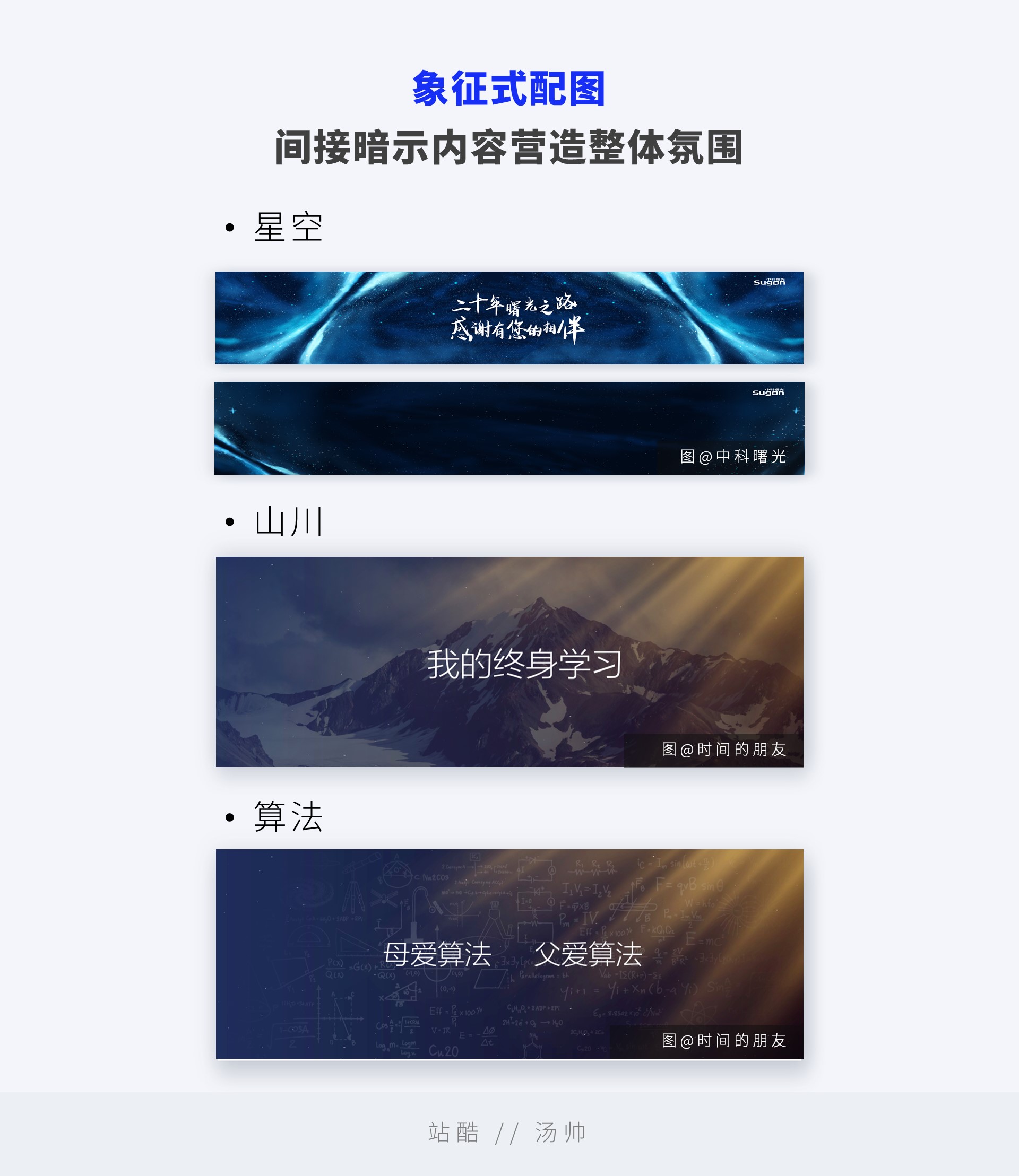 全图型的图片不一定和具体的内容完全一一对应,存在象征的可能,无论是:星空、山川,还是用黑板的粉笔字比喻算法等,都会在实际使用时起到象征的意义。