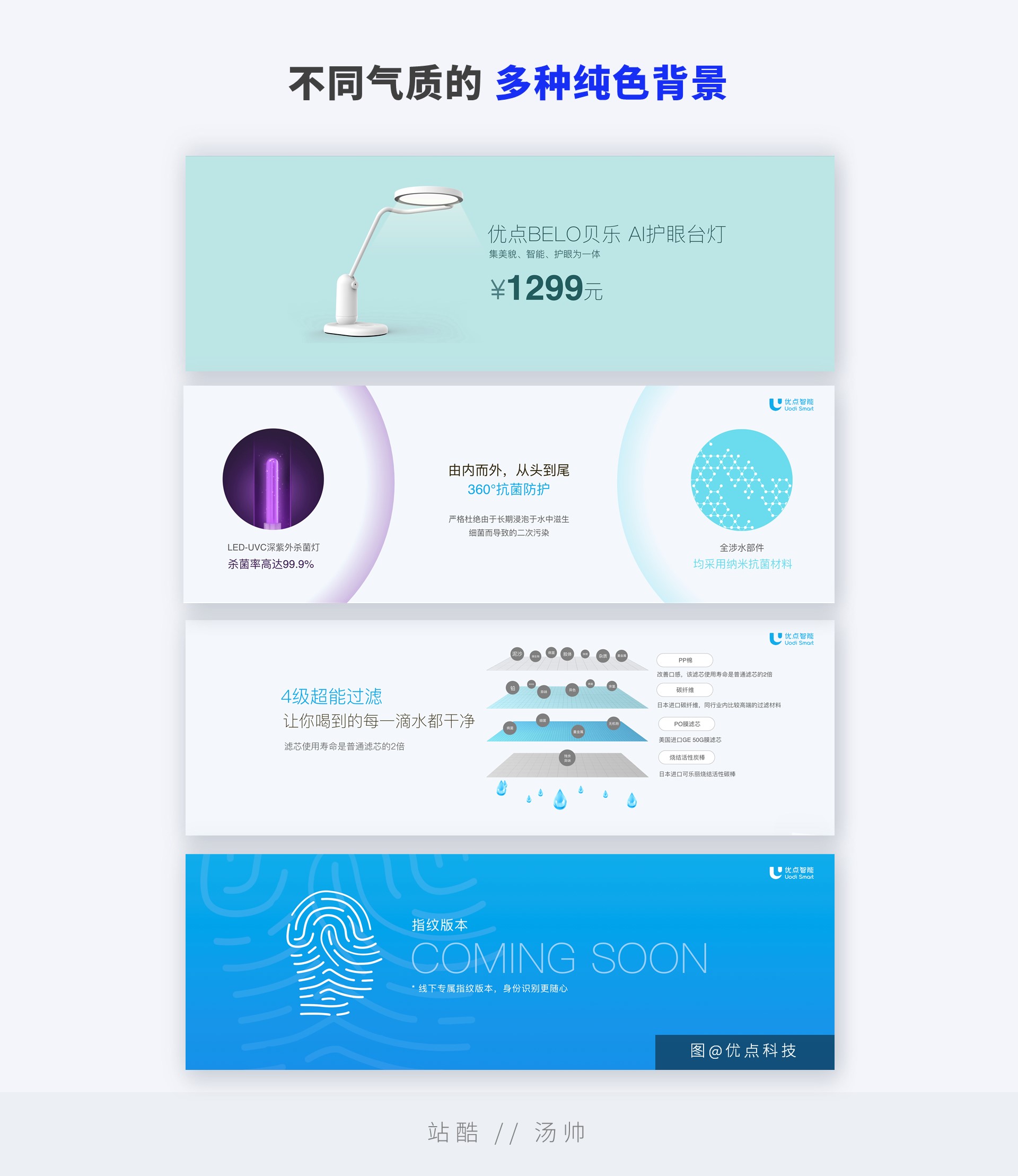 其中分为:纯黑背景和其他颜色的纯色背景。纯黑背景带给人极其稳重的感觉,而其他颜色的纯色背景则相反,带给人干净洁净的感觉。