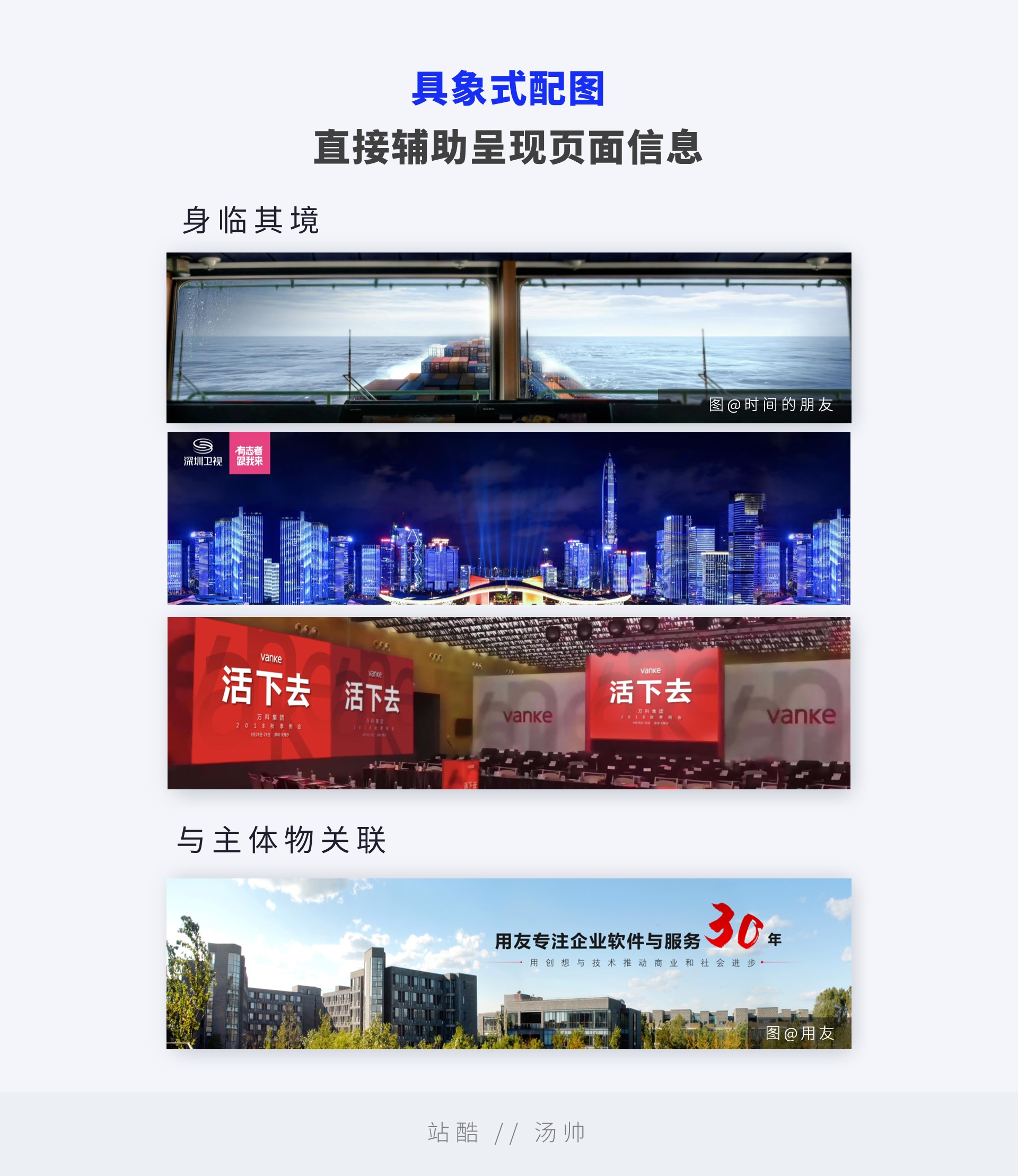 具象的图片让观众直接身临其境,时间的朋友的“大豆君”、“深圳”都是这样的用法;而在一些企业愿景页上,直接放上公司的图片也能体现出非常直接的关联性。
