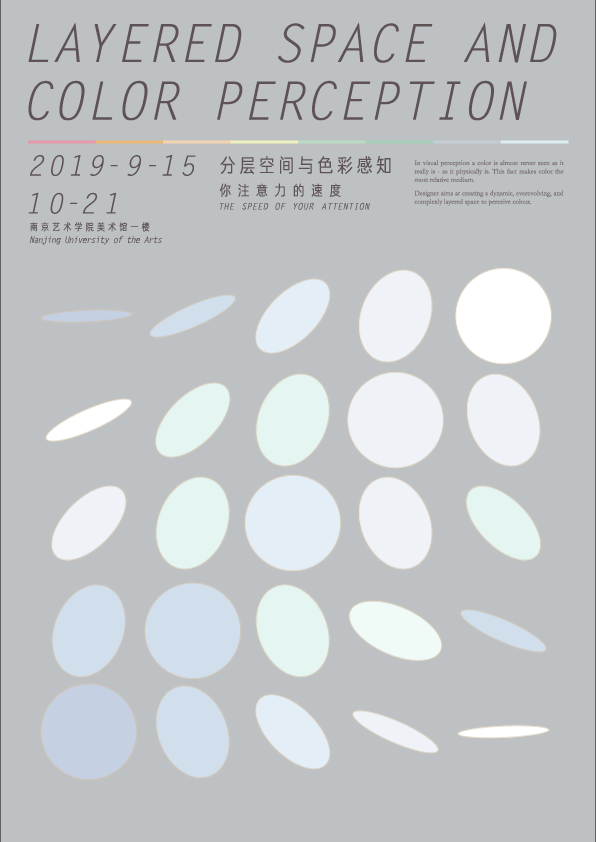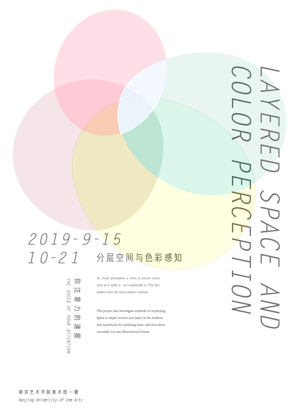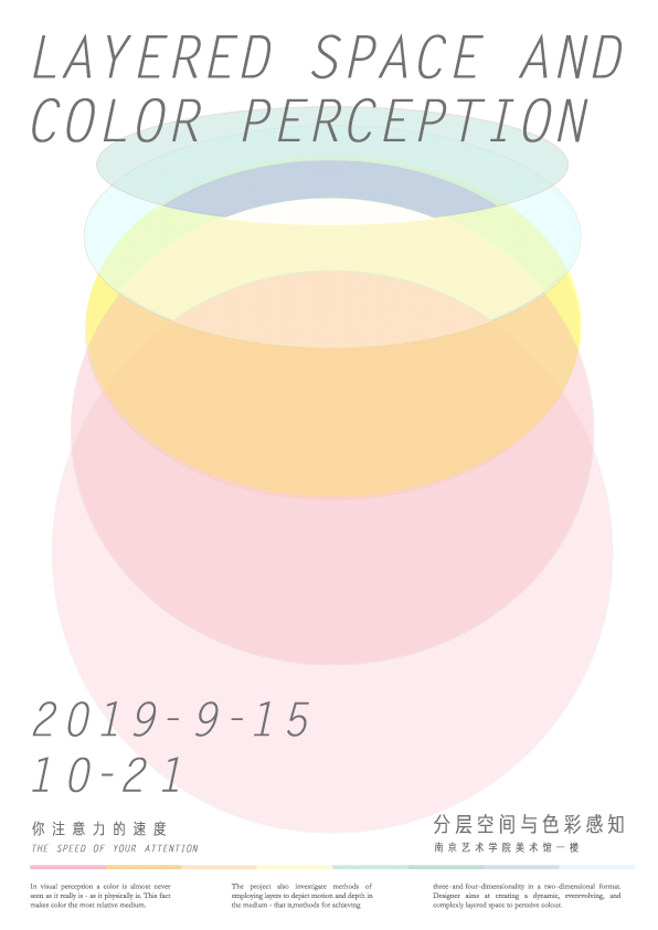 在他2018年的光学实验作品展一一《你注意力的速度》中,光是他作品中最重要的元素、折射和比例的技巧,往往包含每个观众自身的独特经验,藉由使光线穿过一层圆形玻璃或介质,站在不同地点观看,便会产生不同光景。我提取了3个关键词:光/重叠反射/色彩感知,用基本图形圆设计出一系列抽象图形,表现光影色彩之间微弱又无限的变化,构成《你注意力的速度》 展览的视觉设计。关键词基于Olafur Eliasson光学实验作品的特点。