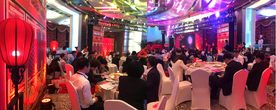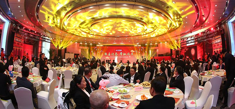 进入会场,大鼓、舞龙、宫灯、圆桌错落有致,