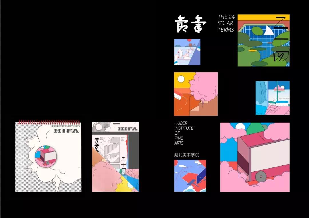 “二十四节气”是新生接触湖美的校考考卷,这次开学礼包也将带领新生来重新感受这一个中国的传统文化。节令与中气是天文概念,它与地支纪月法相对应,而十二生肖则是十二地支的形象化代表,如卯兔,酉鸡,此次视觉设计插画部分将节气与美院一隅结合,运用两套色彩系统构成画面,通过折纸的互动方式使具象的动物来表现抽象的节气概念。每一张插画折纸都能折出对应的生肖形象。