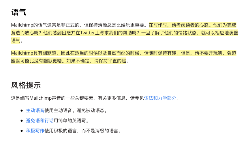收集整理语⾳和语⽓模式后,下一步就是定义它们的规范。如下图👇,是来自 MailChimp 的设计系统 Voice&Tone 的语⾳和语⽓模式规范,详细地定义了规范,比如什么时候⽤轻松的语⽓,什么时候要用严肃的语⽓等。