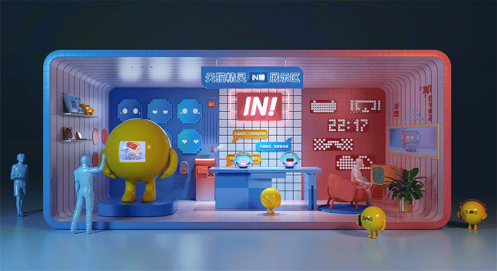 1..线下我们希望打造一个可拆卸移动装置将整个IN糖能力人格化、可视化全方位的展示且可不断复用,让用户在空间中彻底的感受IN糖好玩、好看、好用。将产品核心能力“灵动表情”,“语音通话”,“信息可视”,功能场景化的创意概念具象的表现出来,用户在体验互动的过程中能直观、清晰的了解产品功能。同时线上产品渲染风格也跟随整体创意思路进行设计,保证整个产品多维度统一。