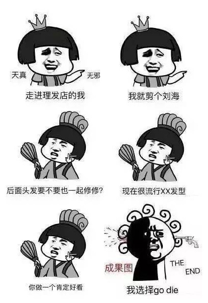 剪完后即使刚剪的发型给了你一种新的丑法,你也只是骂一句“无情!”然后勇敢的走出理发店去买顶帽子,毕竟都是有身份证的文明人。