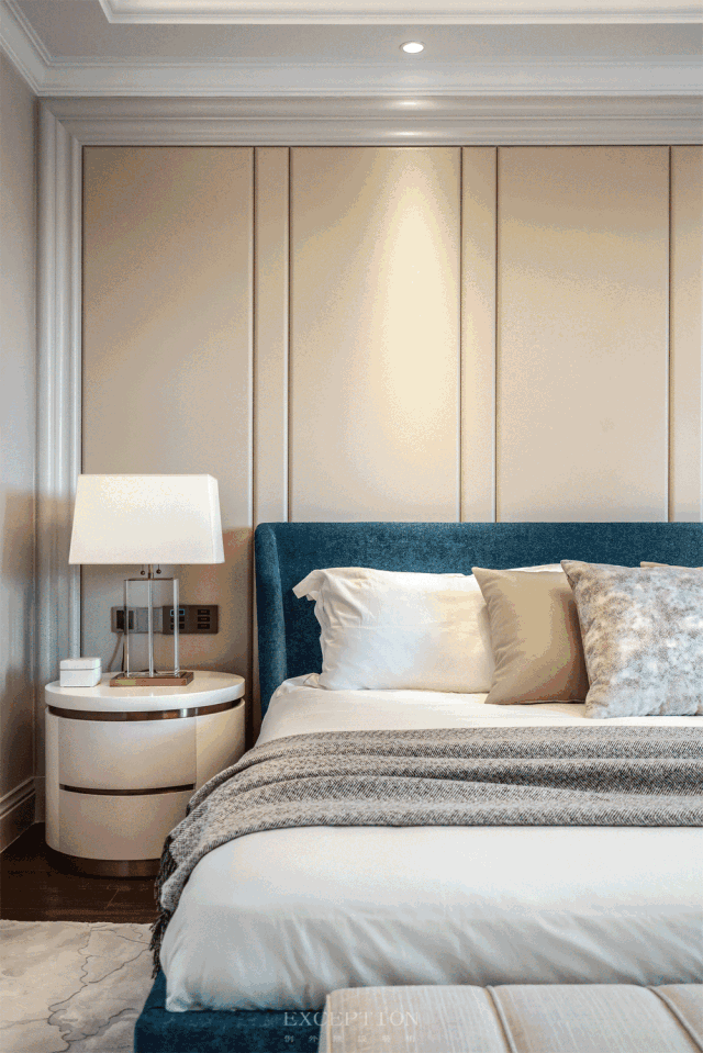谧静舒适的蓝延续到主卧,与一袭素色床品不期而遇,不喧哗却独具格调,恰如艺术与生活的完美邂逅。设计将生活的质感美学毫无保留地呈敬,贝壳白边柜闪耀星星点点的光晕,诉说着惬意舒朗的生活情状,个性圆镜映照出伊人纯真的模样,窗外城景入画,丰盛室内精彩生活。