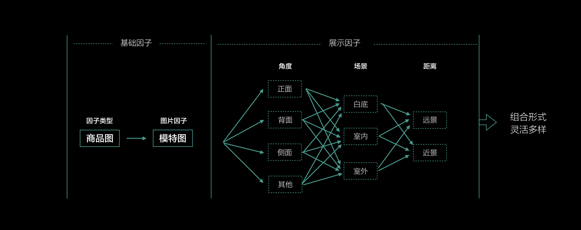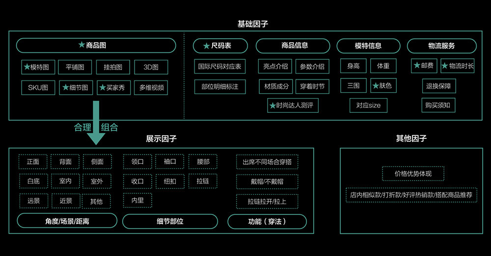 我们把所有维度的详情信息归纳成三大类:基础因子,展示因子,其他因子。计划让每一类因子都可以根据商品素材底料的对应关系填充出合适的详描组合,形成最优最灵活的商品详情。