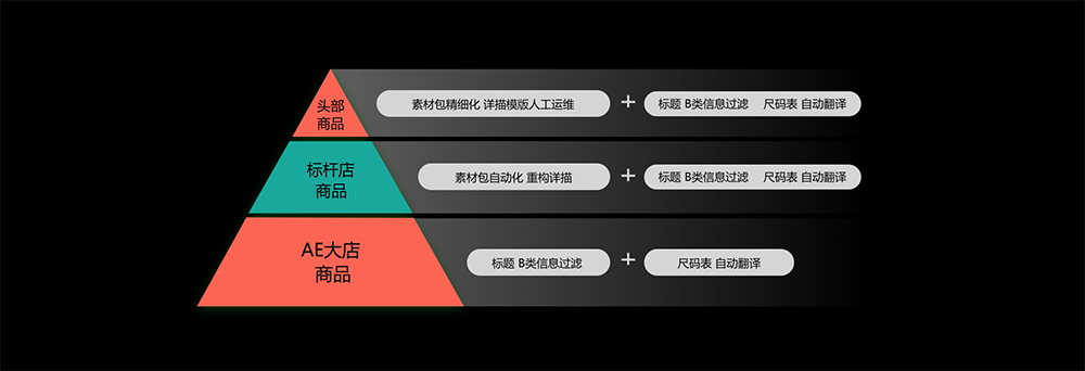 核心产品思路是在铺货过程中提取有素材包的商品,进行内容识别重组后排版生成新的详情内容,并直接完成上架操作,为了保障项目顺利落地,我们拆解了四层设计策略模型分层推进。