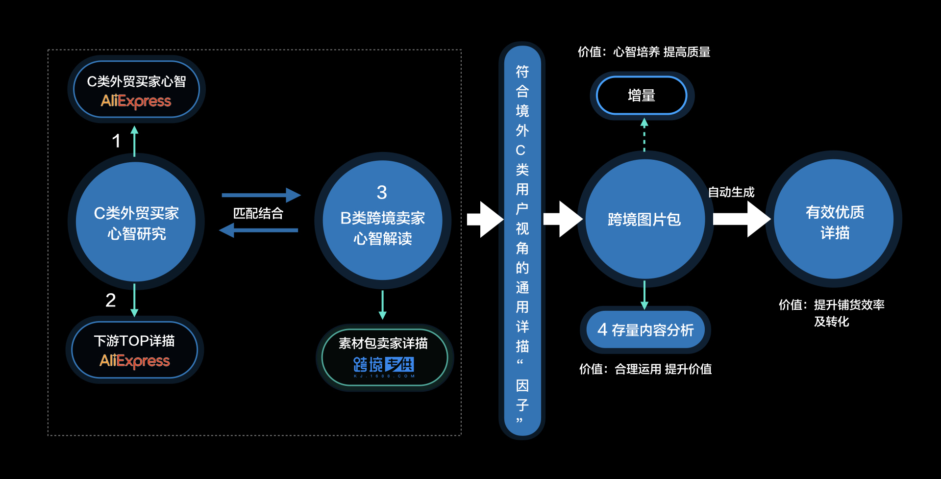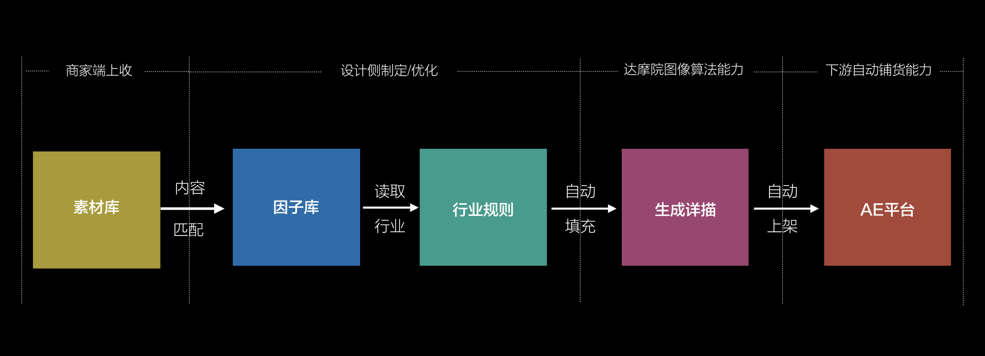 完整方案的串联是最关键的技术能力合成阶段,通过从商家端上收的商品素材,跟因子库匹配后根据不同的行业规则结合达摩院图像算法能力,生成优质且符合消费者心智的详情描述,最后自动上架至C端平台,整个过程精准定位,完全释放人力成本。