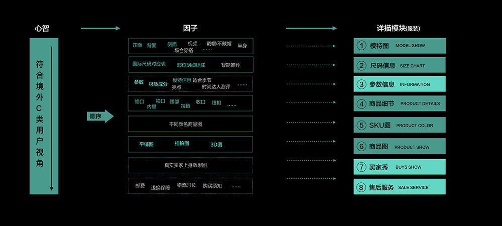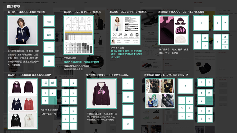 根据用户视角的浏览顺序,定义出了8个细分模块,分别为:模特图、尺码信息、参数信息、商品细节、SKU图、商品图、买家秀、售后服务。当然顺序也不是绝对的,未来可根据投放渠道以及商品实际转化情况做相应的内容取舍调整。