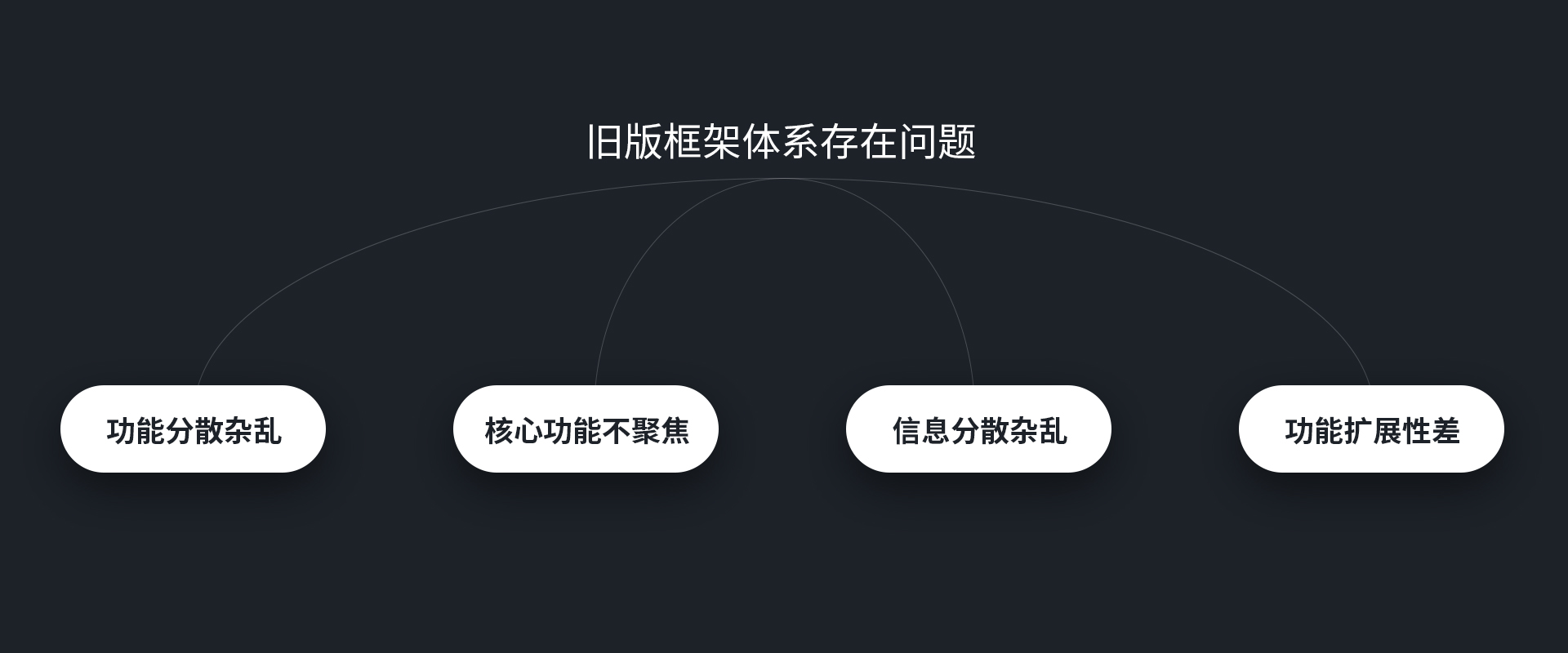 就目前来看,在旧版的框架体系中,功能层级复杂,重点功能难以突破和查找,关联较弱的信息架构严重影响和分散了用户的关注点。随着业务模式不断扩展,编辑页面新需求类型逐渐增多,一套更加具备灵活的拓展能力和管理能力的框架尤为重要。