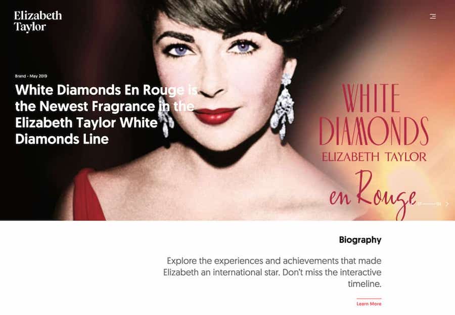 伊丽莎白•泰勒网站(见上图) 在顶部有一个轮播图,上面有关于如何使用它的视觉指导。这使得用户更容易按照自己的节奏来处理内容。