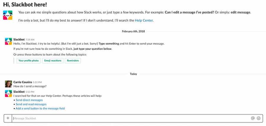 技巧提示:友好地使用主动动词和直接指示。Slack在这方面做得很好,它的机器人服务让人感觉非常逼真(即使你明白它并不是真人)。